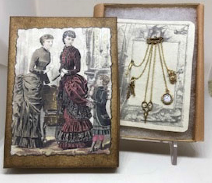 Fancy Chatelaine Boxed Includes small button hook, perfume flask,keys, watch, and scissors that open and close. All mounted on a pin. This chatelaine is suitable for 12” fashion dolls. Box measures 4” x 5 1/2”