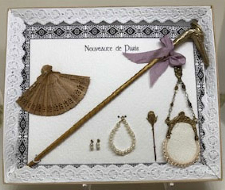 Fashion Presentation Set Suitable for 12” fashion dolls includes a maple wooden fan, a hat pin, whippet walking stick, a pocket book with chatelaine hook, and a vintage pearl necklace set. Box measures 5” x 6”